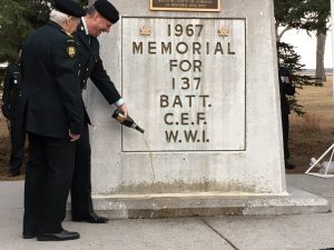Members of the Regiment conducted three separate and symbolic ceremonies around Calgary. Attendees included Brigadier General Nick Stanton, Honorary-Colonel Douglas Mitchell, Honorary-Lieutenant Colonel Michael Lang, as well as Colonel Eppo van Weelderen. The first ceremony took place at Pattison Bridge on Macleod Trail where a simple marker commemorates the actions of Private John Pattison. On that date a century earlier, Private Pattison took part in the Battle of Vimy Ridge and for his courageous actions there, he was awarded the Commonwealth’s highest honour for valour, the Victoria Cross. With members of the Pattison family present, The King’s Own conducted a poignant ceremony in recognition of Private Pattison, who was killed in action shortly after his actions at Vimy. The Regiment then met at the 137